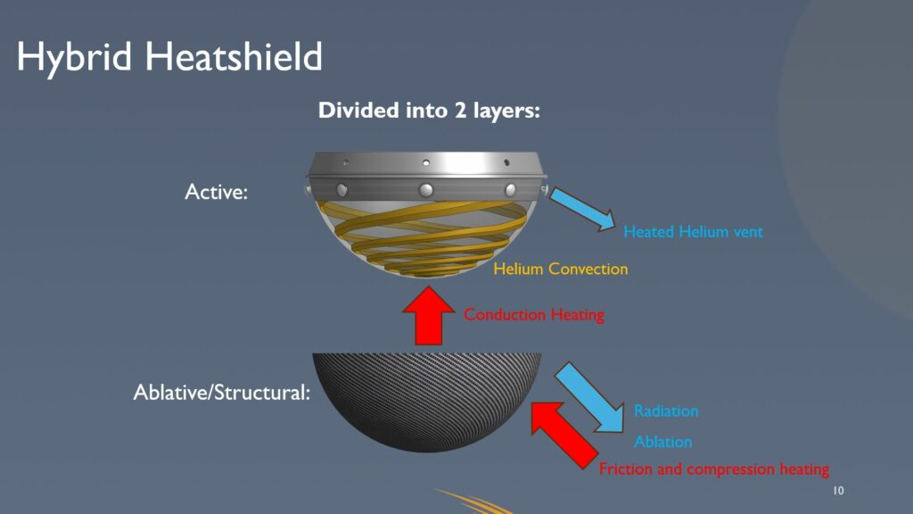 The hybrid shield concept was created as a successor to the active cooling concept and is based on the work of Active Heatshield Cooling Solutions, which won the ArianeGroup Prize in the ESA Student Aerospace Challenge 2024 for its complete assessment of the issue and relevance, as there is still no reliable solution for safe descent into the atmosphere. This system had several drawbacks, such as high fuel consumption and greater weight than current thermal protection systems. Based on feedback from Ariane researchers working on carbon composite heat shields, the concept was transformed into the HARTS system. HARTS aims to compensate for the disadvantages of composite heat shields, which are a newly used technology due to their structural strength and the possibility of relamination or replacement of composite sheets, making them reusable. Their main disadvantage is the lack of cooling through ablation and their conductivity, which can dangerously heat up the internal components of spacecraft. Adding active cooling compensates these disadvantages by heat dissipation with excess helium, which is used to pressurize fuel tanks. The hybrid shield thus provides reliable protection against extreme temperatures and allows for the regulation of temperature at heat flux peaks.