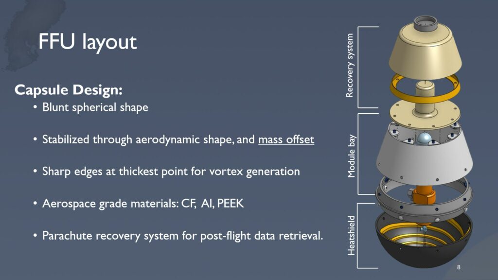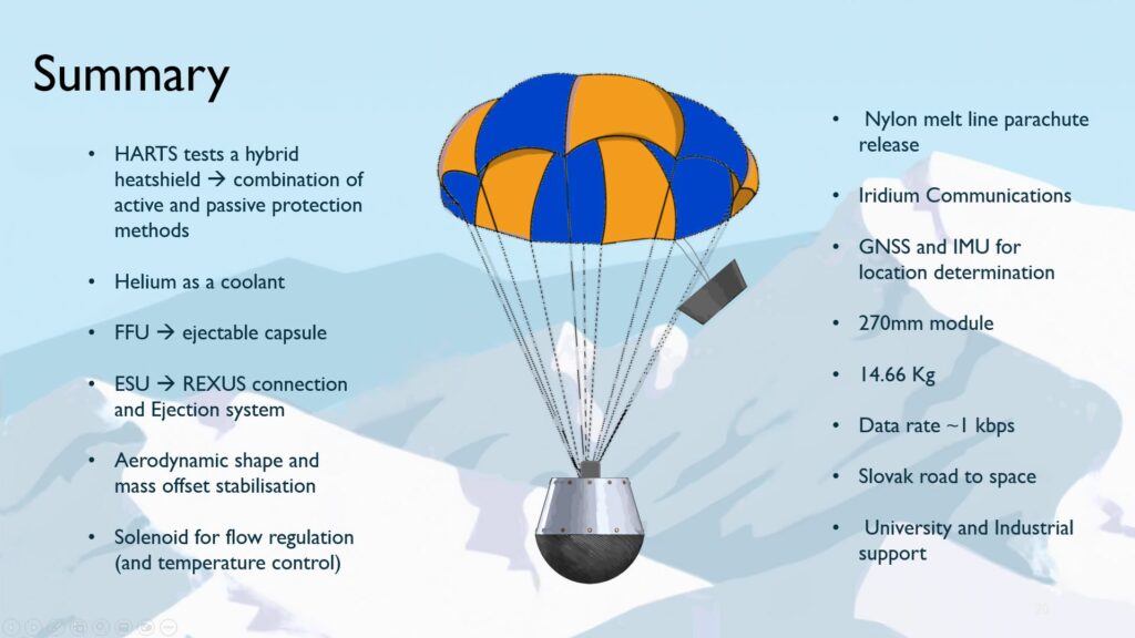 The heat shield will be launched on an ejectable experimental capsule on a REXUS sounding rocket to an altitude of ~85 km in March 2026. The capsule separates from the rocket at the highest point of the trajectory and begins to transmit telemetry and thermal data about its state. During the descent through the atmosphere, sensors will monitor the temperature of the shield, and if this temperature reaches a critical value, helium will be automatically released into the pipes integrated in the ablative shield, which will dissipate excess heat. At an altitude of 4 km, the parachute opens, which will ensure the safe return of the capsule. This experiment will provide important insights into function under realistic atmospheric descent conditions and allow us to improve on the technology of hybrid heatshields.